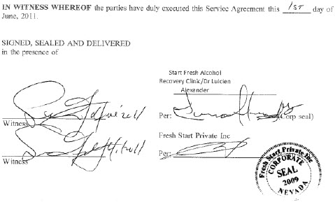 | in the presence of Start Fresh Alcohol Recovery Clinic/Dr Lucien Alexander per: (Corp seal) Witness Fresh Start Private Inc |